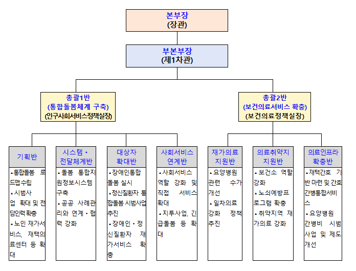 조직은 보건복지부 장관이 기존의 의료-간호-간병 통합지원추진단을 확대 개편하는 형태로 이끌게 됩니다.