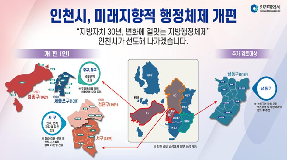 인천시는 2026년 7월을 목표로 행정구역 개편을 추진하고 있습니다. 이번 개편은 단순한 구역 개편이 아니라 급격한 인구 증가와 도시 확장으로 인한 행정 효율성 문제를 해결하고 지역별 특성에 맞는 맞춤형 행정서비스를 제공하기 위한 중요한 조치입니다.