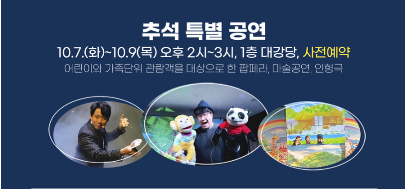 또한 명절 기간 내내 팝페라, 마술 공연, 인형극, 피에로 씨와 함께하는 사진 촬영, 추석 특집 영화 등 다양한 문화 프로그램이 진행되어 전 연령층이 즐거운 시간을 보낼 수 있습니다. 또한 전통 민속놀이 체험 공간에서는 어린이부터 어른까지 윷놀이와 투호놀이를 함께 즐길 수 있어 다양한 명절 분위기를 느낄 수 있습니다.
